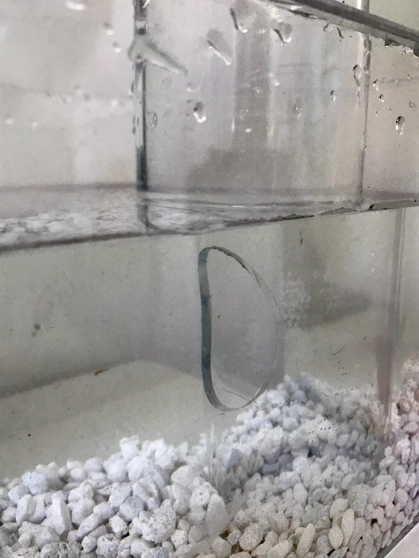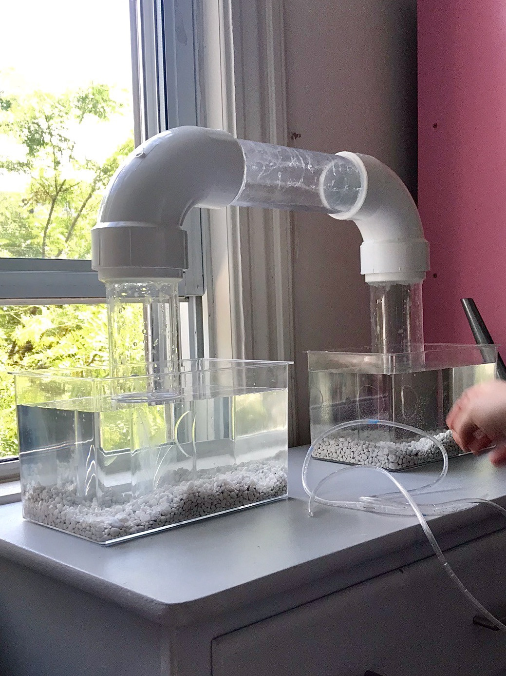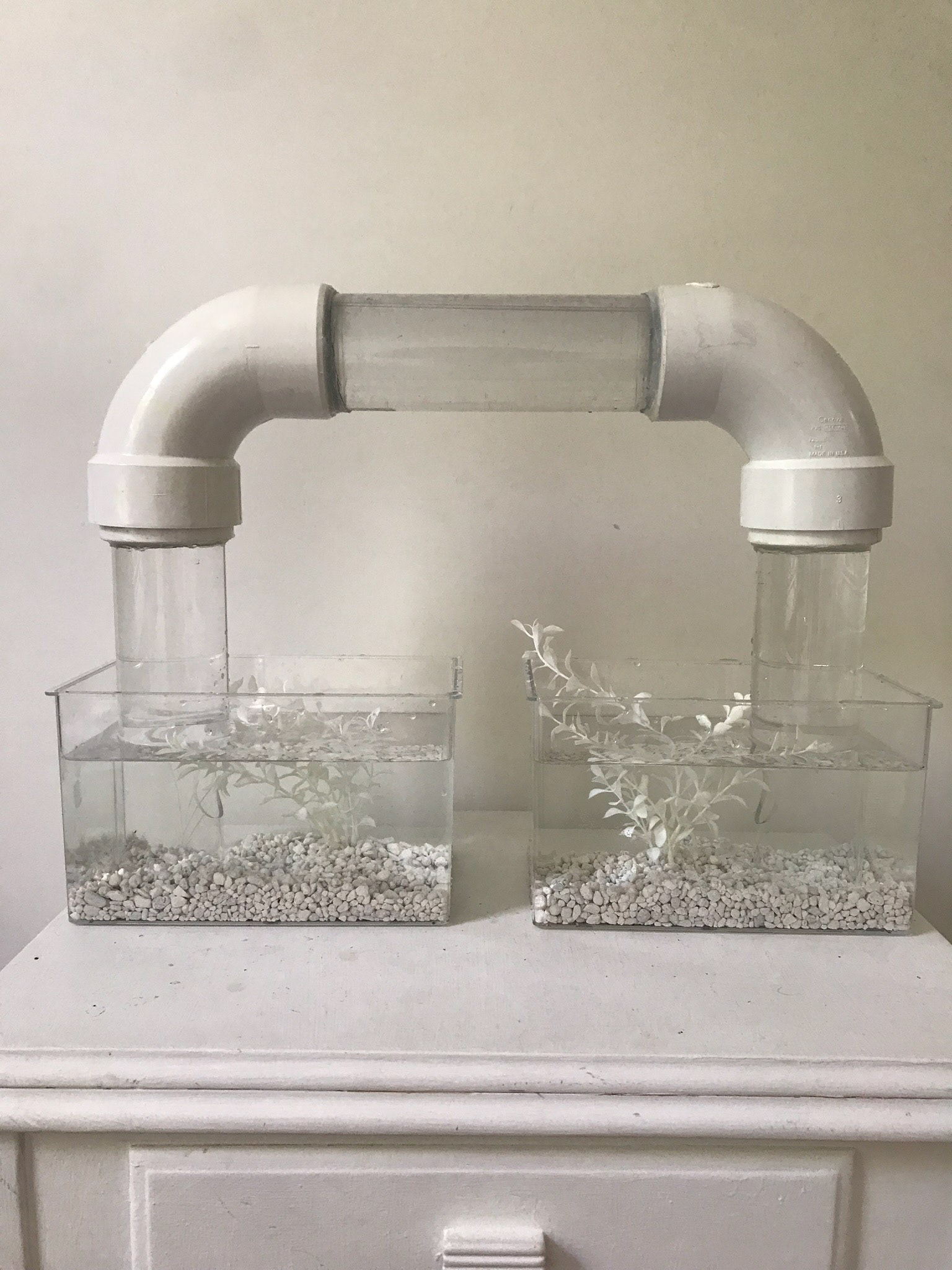 A Gravity Bridge allows fish to swim above the water line and travel between two aquariums. Acrylic tubing, PVC elbows & hubs, acetate, vinegar & silicone